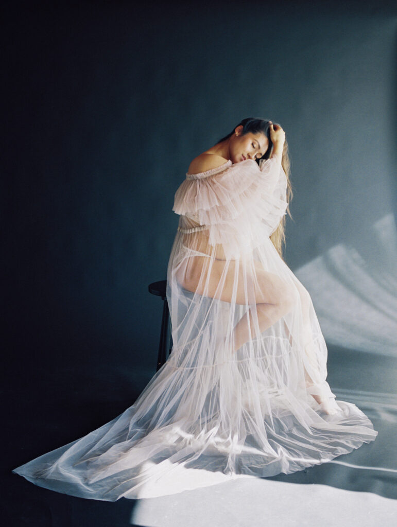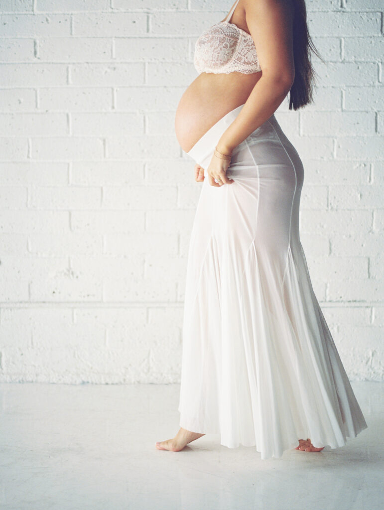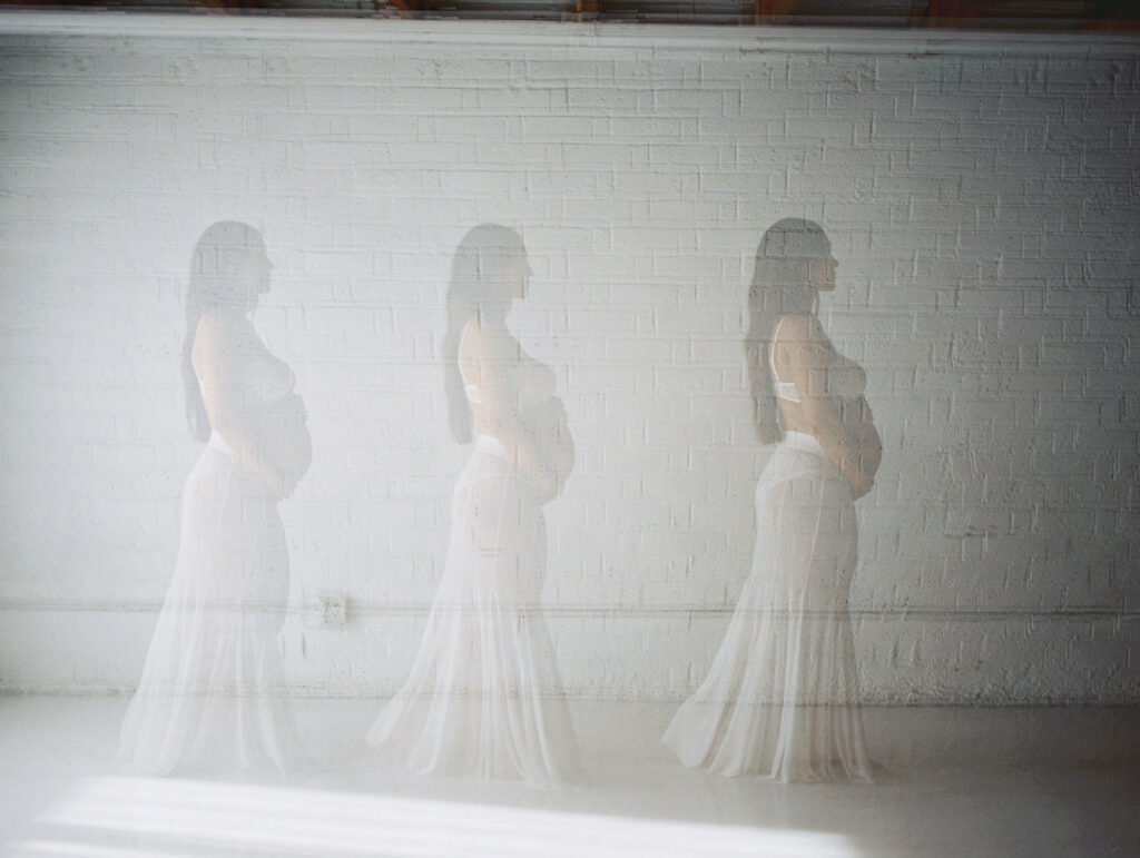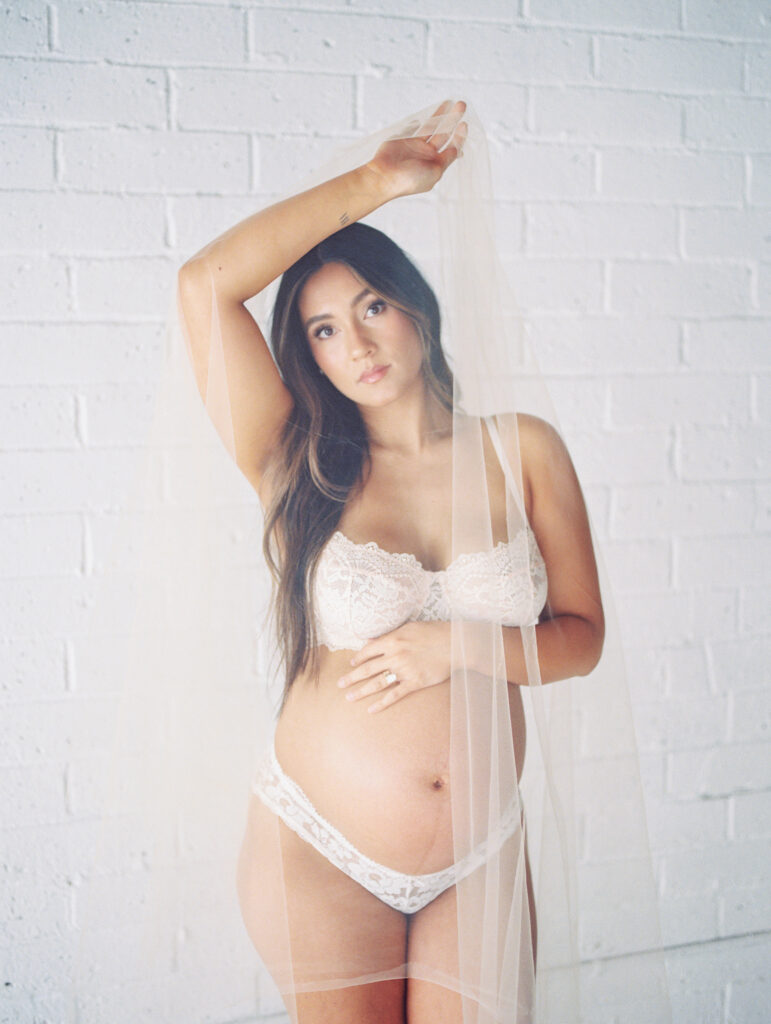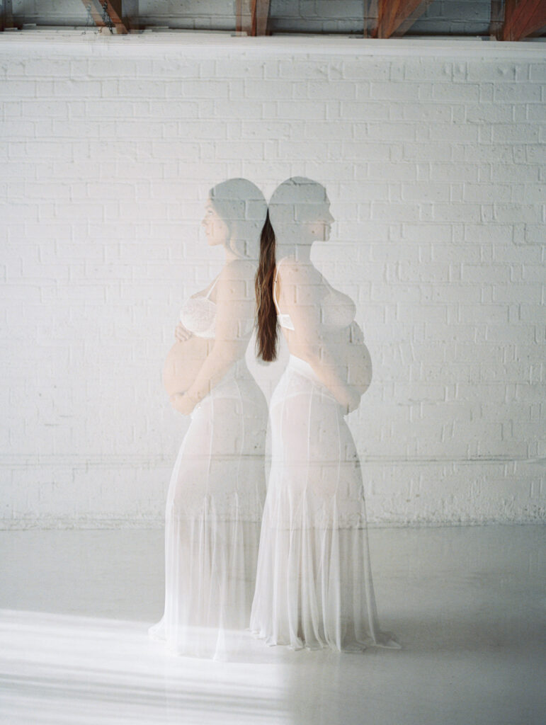 Juxtaposition. The word of the session. Defined as the act of placing two or more elements side by side, especially for the purpose of highlighting their contrast or creating meaningful comparison. Pregnancy is strength and vulnerability, anticipation and uncertainty, visibility but also intimacy. The soft materials and flowing fabrics of her wardrobe set against the rough and raw materials in the studio visually represent the contrasting elements of pregnancy.