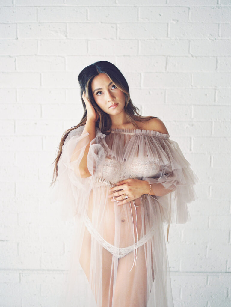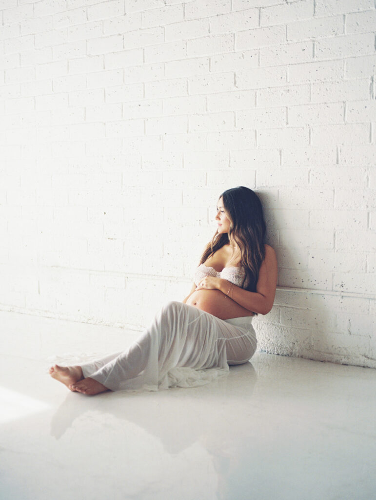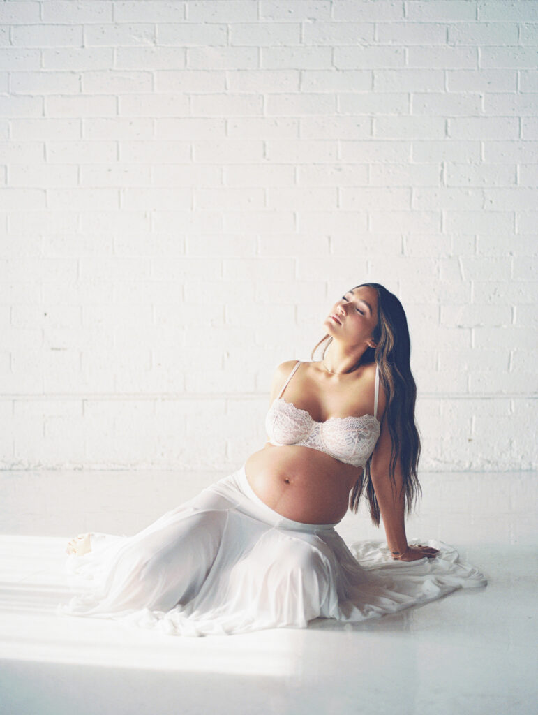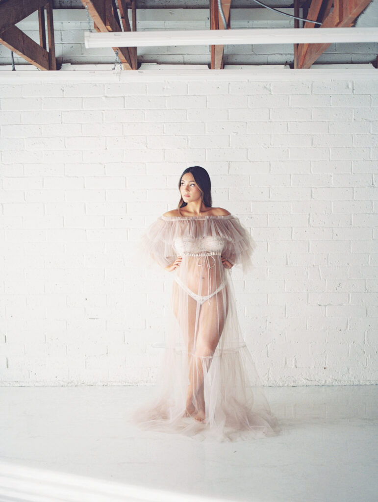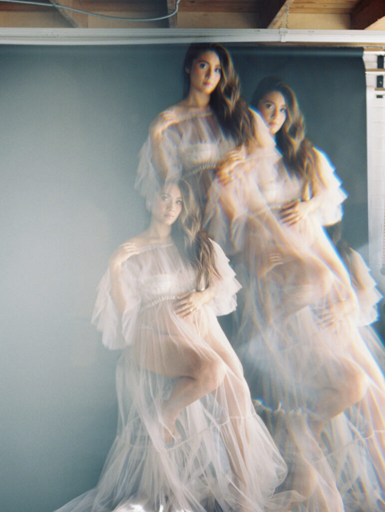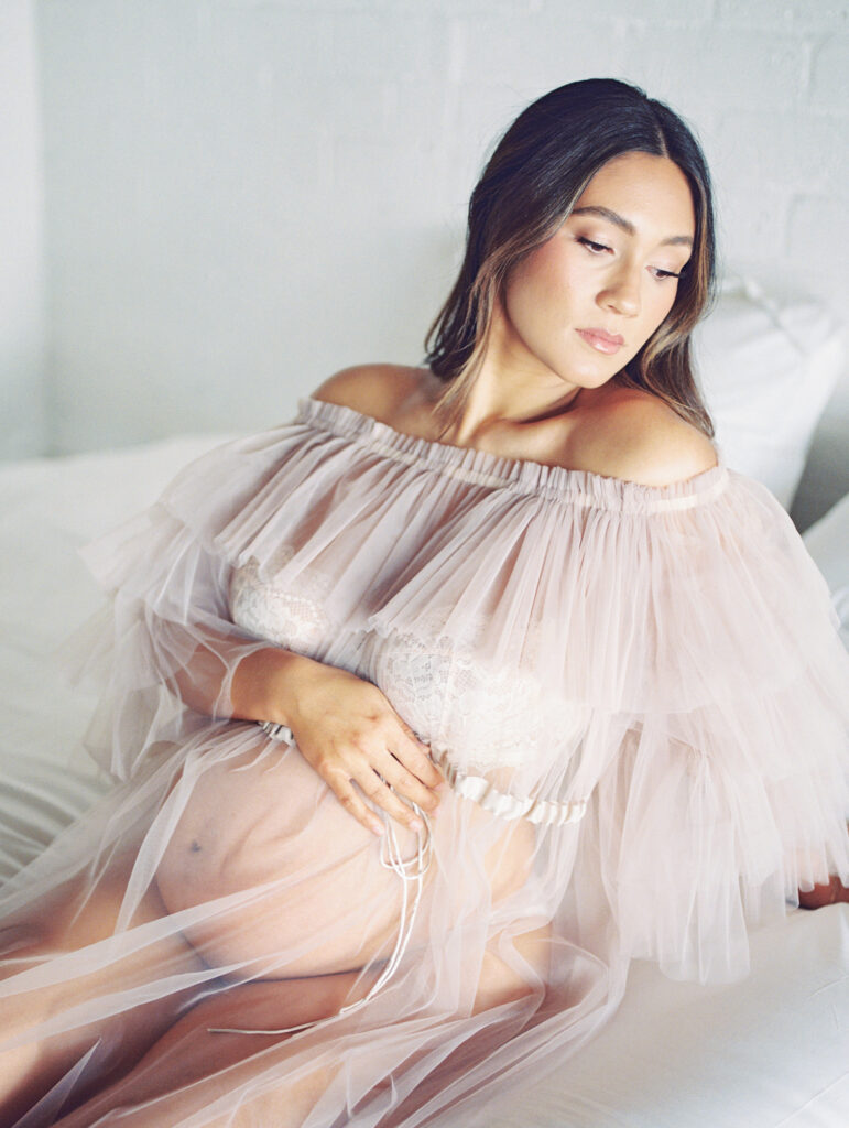Juxtaposition. The word of the session. Defined as the act of placing two or more elements side by side, especially for the purpose of highlighting their contrast or creating meaningful comparison. Pregnancy is strength and vulnerability, anticipation and uncertainty, visibility but also intimacy. The soft materials and flowing fabrics of her wardrobe set against the rough and raw materials in the studio visually represent the contrasting elements of pregnancy.