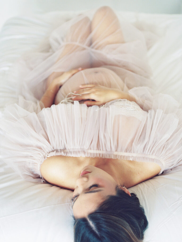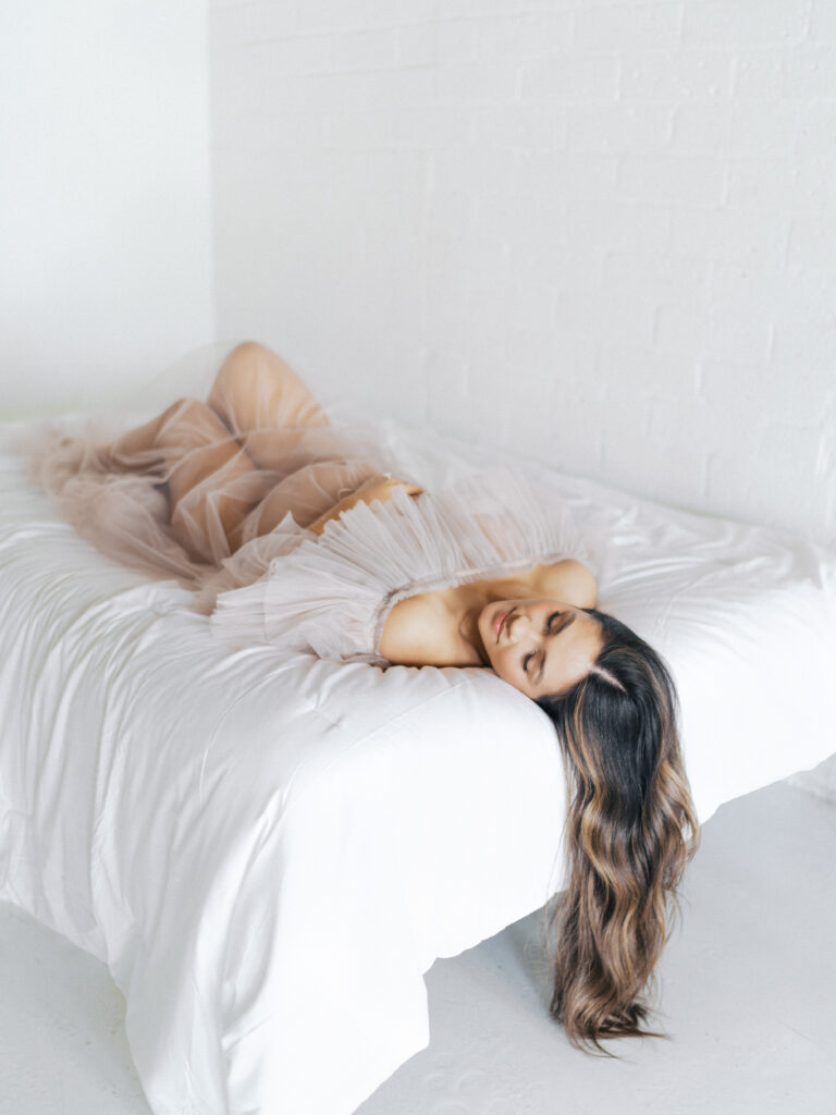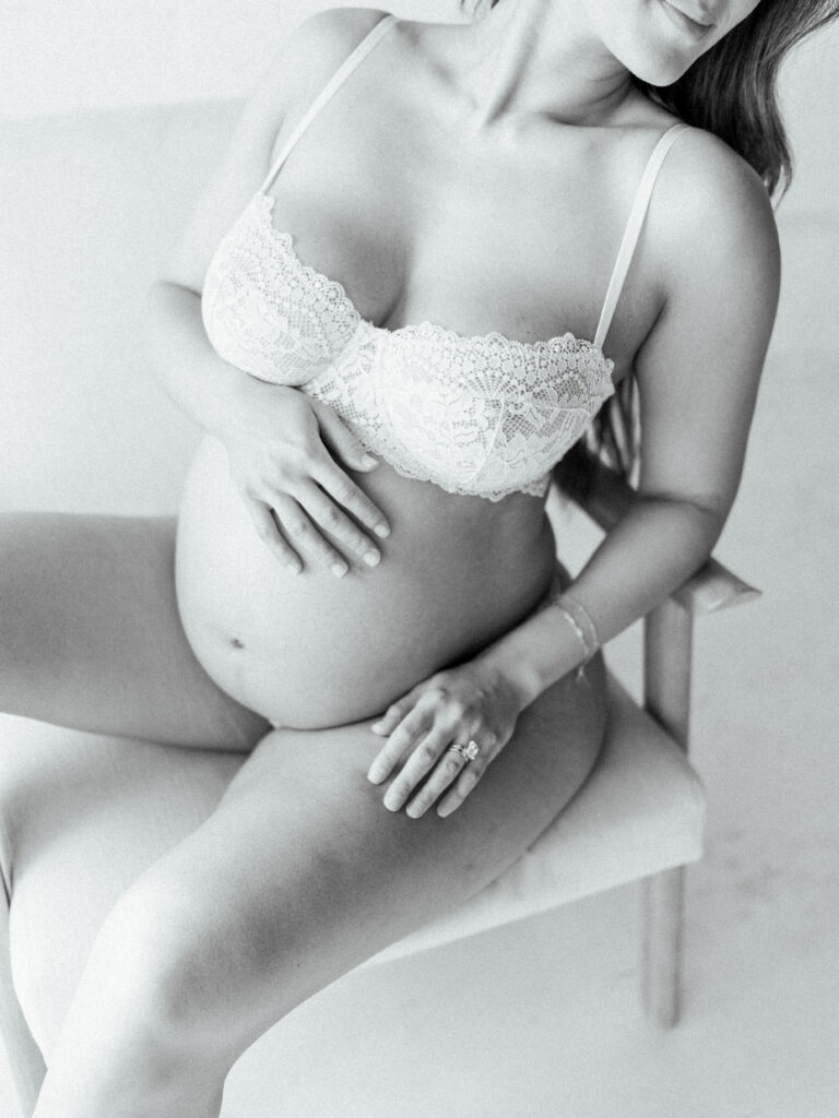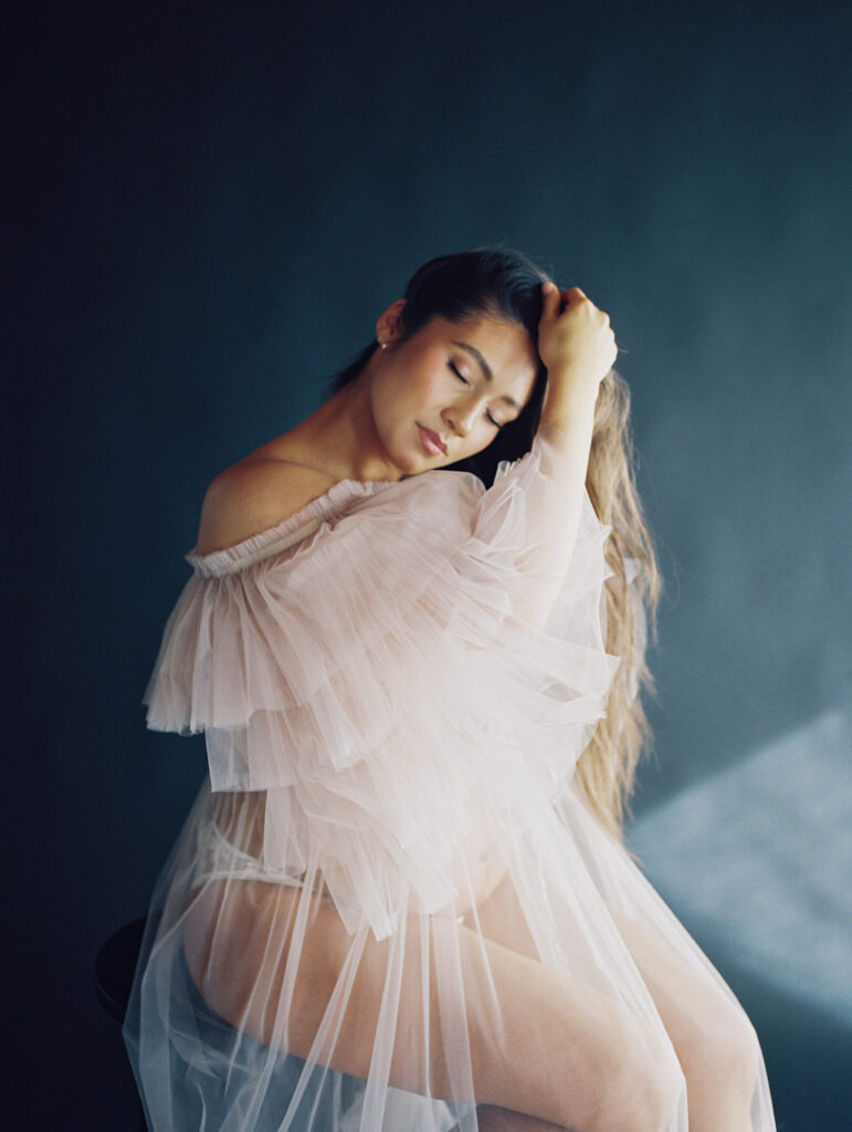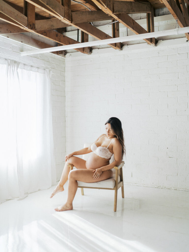 Juxtaposition. The word of the session. Defined as the act of placing two or more elements side by side, especially for the purpose of highlighting their contrast or creating meaningful comparison. Pregnancy is strength and vulnerability, anticipation and uncertainty, visibility but also intimacy. The soft materials and flowing fabrics of her wardrobe set against the rough and raw materials in the studio visually represent the contrasting elements of pregnancy.